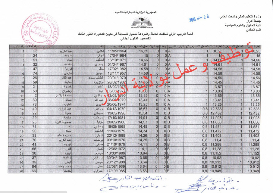 توظيف وعمل بولاية ادرار قائمة المترشحين لمسابقة الدكتوراه تخصص القانون الجنائي جامعة ادرار