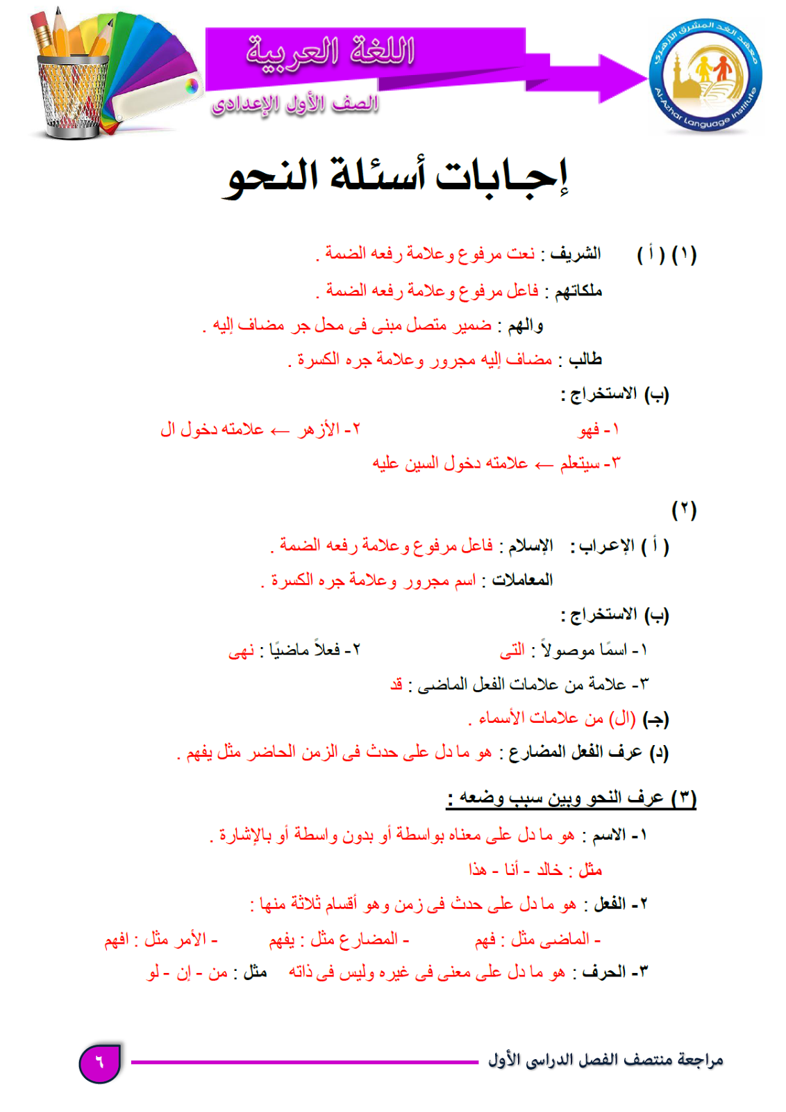 مذكرة عربي للاول الاعدادي الازهري ترم اول 2018