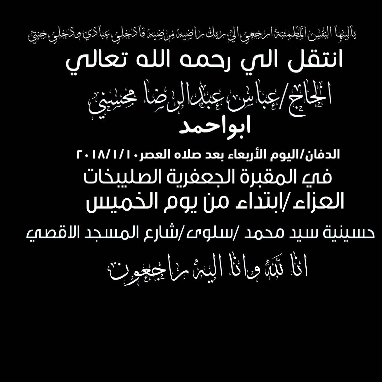 د هشام الصالح Twitterissa خالص تعازينا القلبية الى آل كاكولي الكرام وآل محسني الكرام بفقيدهم الحاج المرحوم عباس عبدالرضا محسني للفقيد الرحمة والمغفرة ولكم الصبر والسلوان أنا لله وانا إليه راجعون Fchoiceq8