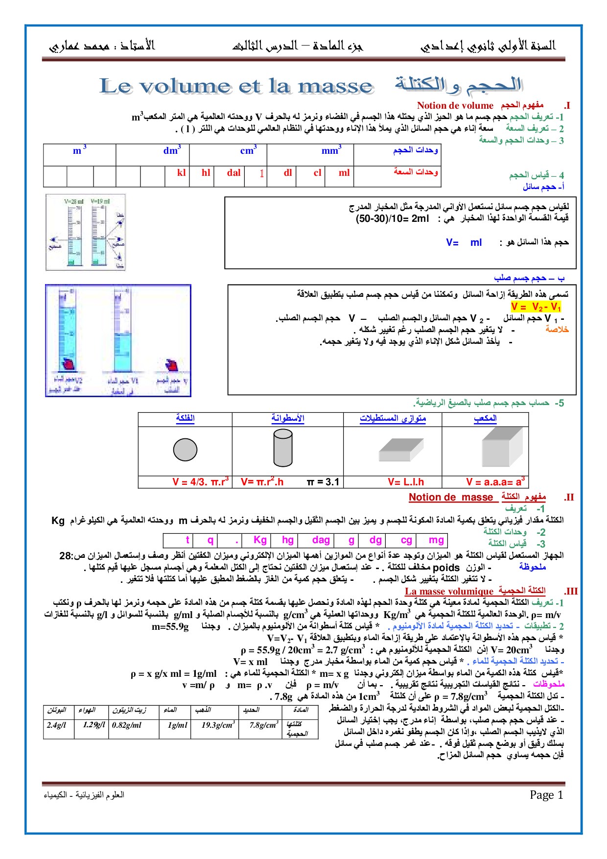 الحجم والكتلة ملخص الدرس 1 Alloschool