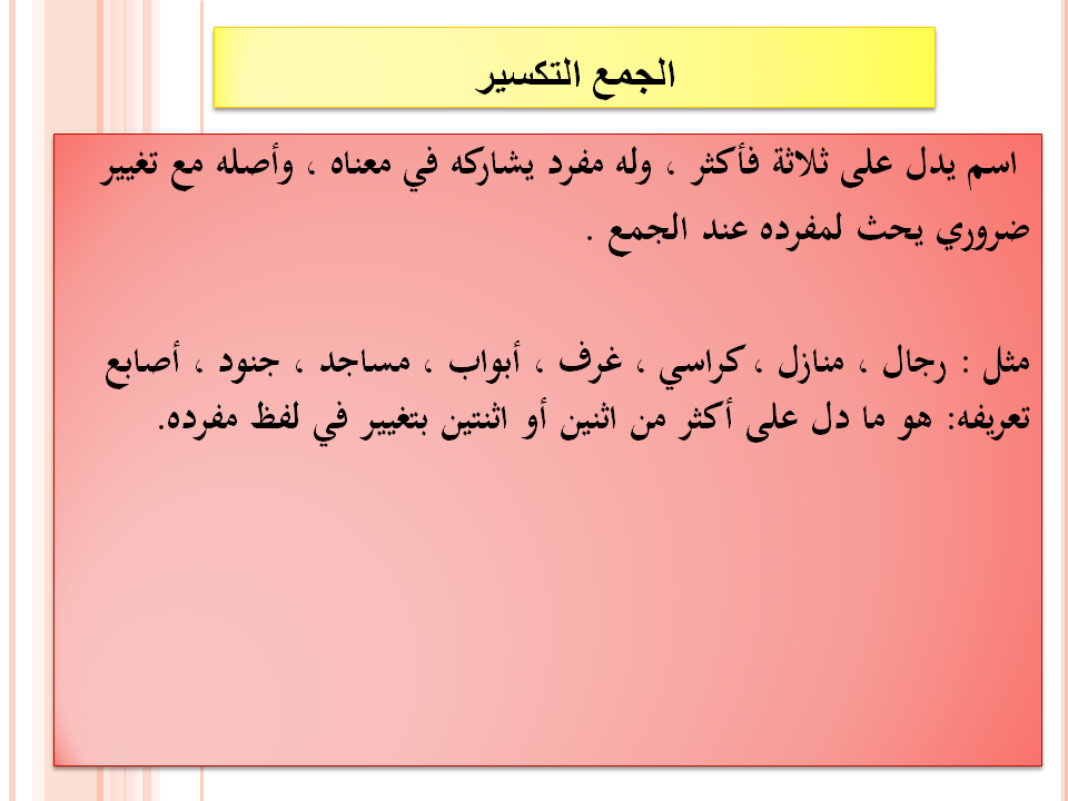 جمع التكسير له فائدة صرفية مهمة هي معرفة اصول الاسماء فهو مثل التصغير يرد الاشياء الى اصولها مثل. تأمل الجمل الآتية. هو ما دل على أكثر. والمقصود بأنه أكثر من اثنين أي جمع مذكر مثل.
