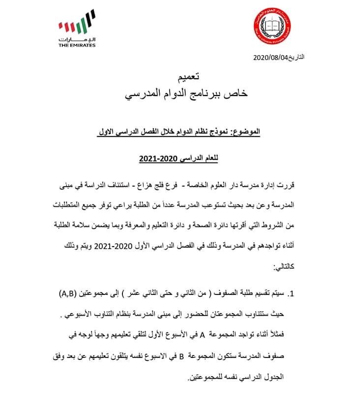 تعميم ببرنامج الدوام الرسمي في مدرسة دار العلوم الخاصة 2020 2021 أخبار الدوام الفصل الأول 2019 2020 المناهج الإماراتية