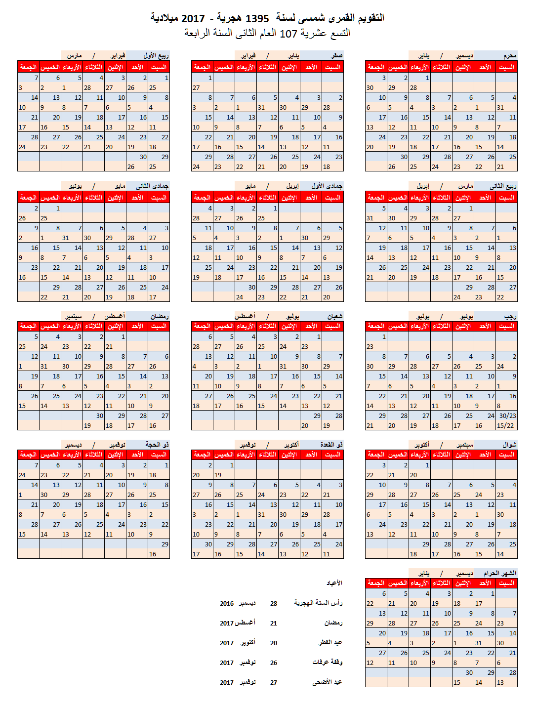 التقويم القمرى شمسى لسنة 1396 هجرية 2017 ميلادية