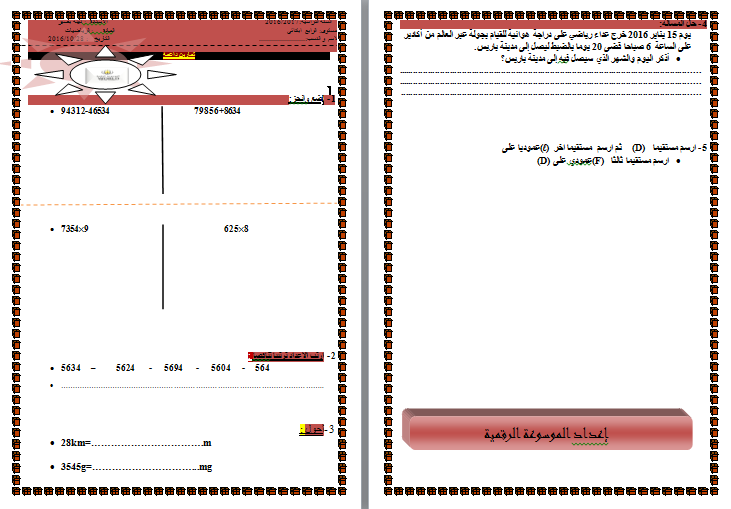 تمارين داعمة للمستوى الرابع ابتدائي في مادة الرياضيات تتضمن بعض عمليات الجداء والضرب وتمارين اخرى الموسوعة الرقمية