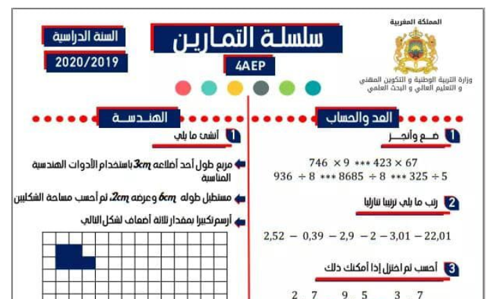 تمارين في الرياضيات مع التصحيح للمستوى الرابع