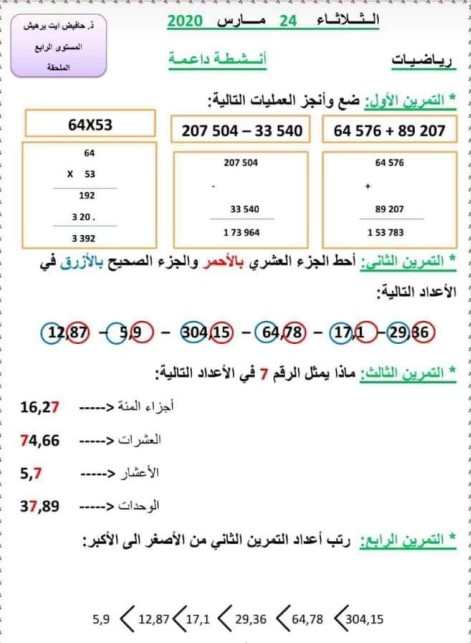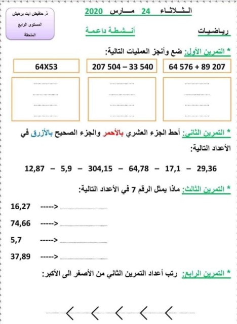 تمارين الدعم للمستوى الرابع ابتدائي مع التصحيح مادة الرياضيات