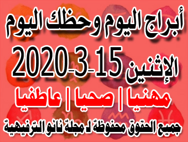 جديد توقعات اليوم 16 مارس 2020 الأبراج الإثنين 16 3 2020 حظك اليوم الإثنين 16 3 2020 بالتفصيل مجلة نانو الترفيهية
