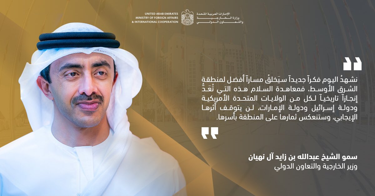 وزارة الخارجية والتعاون الدولي على تويتر سمو الشيخ عبدالله بن زايد آل نهيان وزير الخارجية والتعاون الدولي في خطابه اليوم أثناء مراسم التوقيع على معاهدة السلام بين دولة الإمارات ودولة إسرائيل في